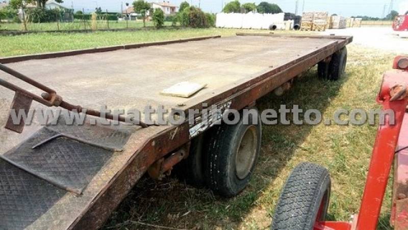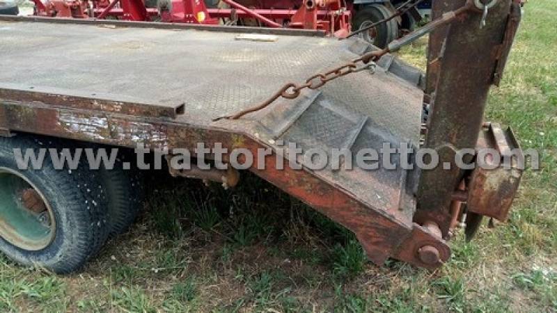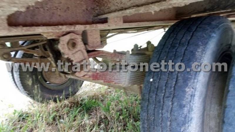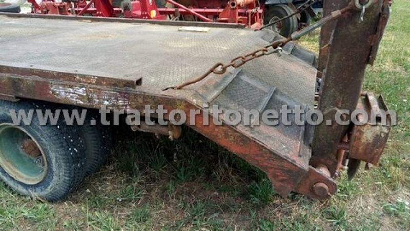 | Attrezzi accessori | Rimorchio con portata 100 q, tara 41,50 q, dotato di rampe idrauliche, sospensioni a balestra, frenatura pneumatica. Misure 2,40x7,72 m. Pneumatici doppi 7.50 R15, SEMINUOVI. Targa TV18712 |