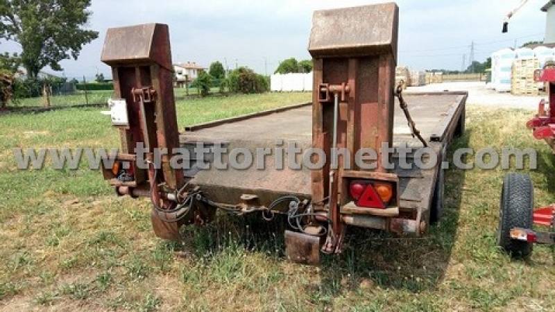 Rimorchio con portata 100 q, tara 41,50 q, dotato di rampe idrauliche, sospensioni a balestra, frenatura pneumatica. Misure 2,40x7,72 m. Pneumatici doppi 7.50 R15, SEMINUOVI. Targa TV18712